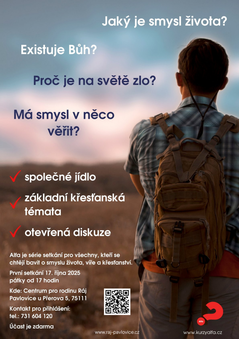 Kurz Alfa bude od 17.října 2025 v Pavlovicích u Přerova v Centru pro rodinu Ráj. (Pokud nemáte hlídání pro své děti, pomůžeme vám s tím, dejte nám to vědět a vezměte je s sebou.) Večer začíná vzájemným povídáním u večeře, pak pokračuje shlédnutím videa k tématu a nakonec si povídáme o tématu v menších skupinkách. Přihlášky na telefonu: 731 604 120 nebo na emailu: hana.skoloudova@raj-pavlovice.cz