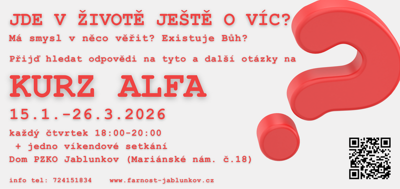 Série setkání pro věřící i nevěřící. Pro každého, kdo přemýšlí o smyslu života, chce prozkoumat křesťanskou víru, chce mít možnost zeptat se. Zároveň i pro ty, kdo věří, ale neví, jak o tom mluvit s ostatními...